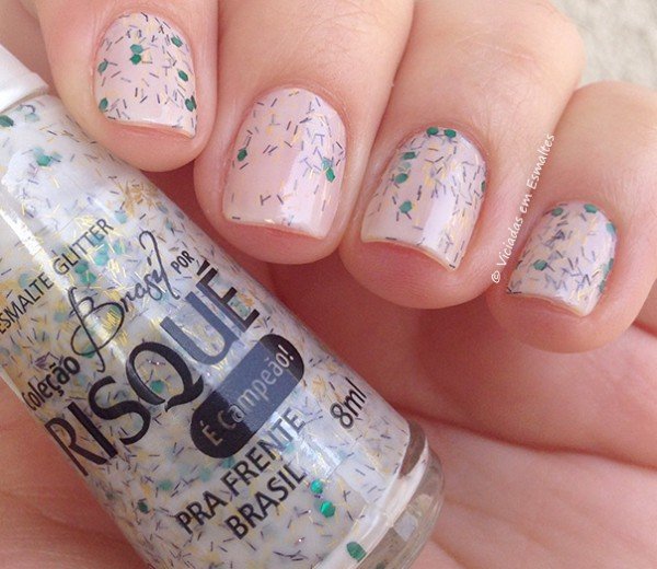 O esmalte Pra Frente Brasil é branco cremoso com glitter hexagonal verde e “glitter risquinho” azul e dourado. Embora ele seja assim todo trabalhado no brilho ao mesmo tempo esse esmalte é muito delicado e deixa as unhas um amor.